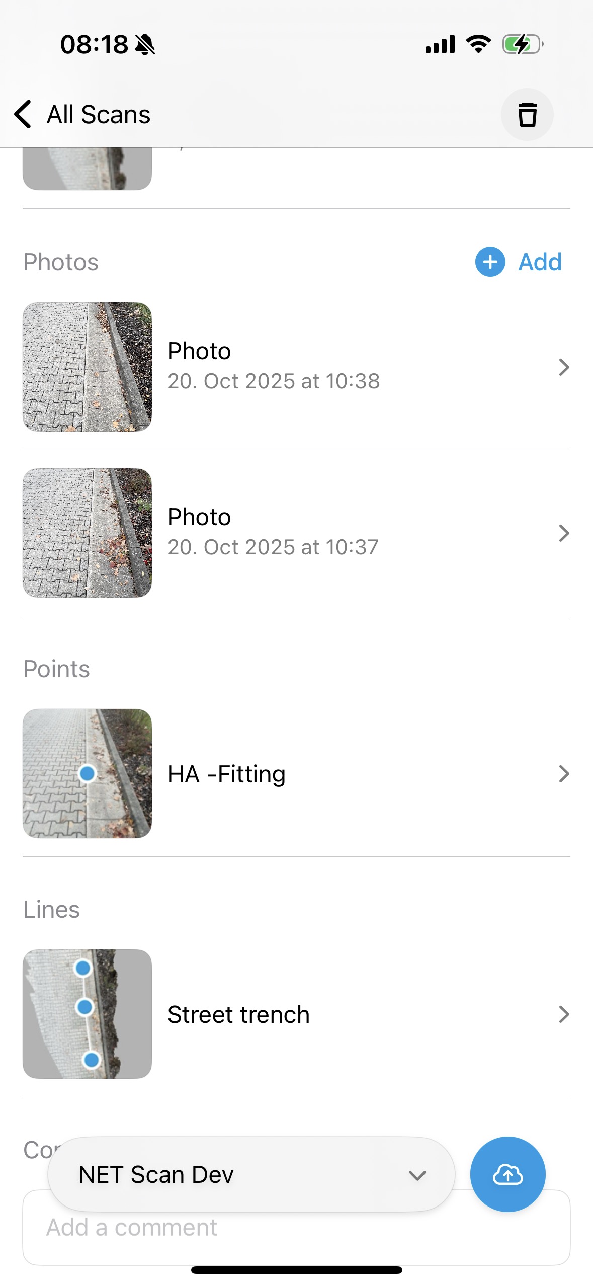 Falls Fotos vorhanden sind, werden diese nach dem Scan aufgelistet. Über “Hinzufügen” können neue Fotos erstellt und dem Scan hinzugefügt werden, solange dieser noch nicht hochgeladen wurde.