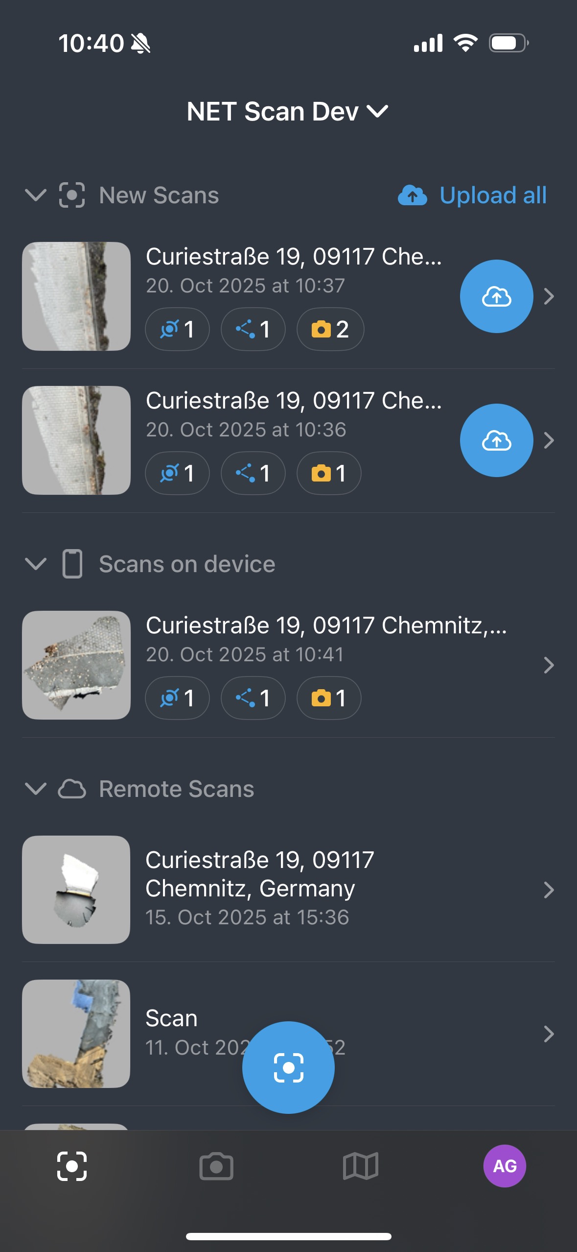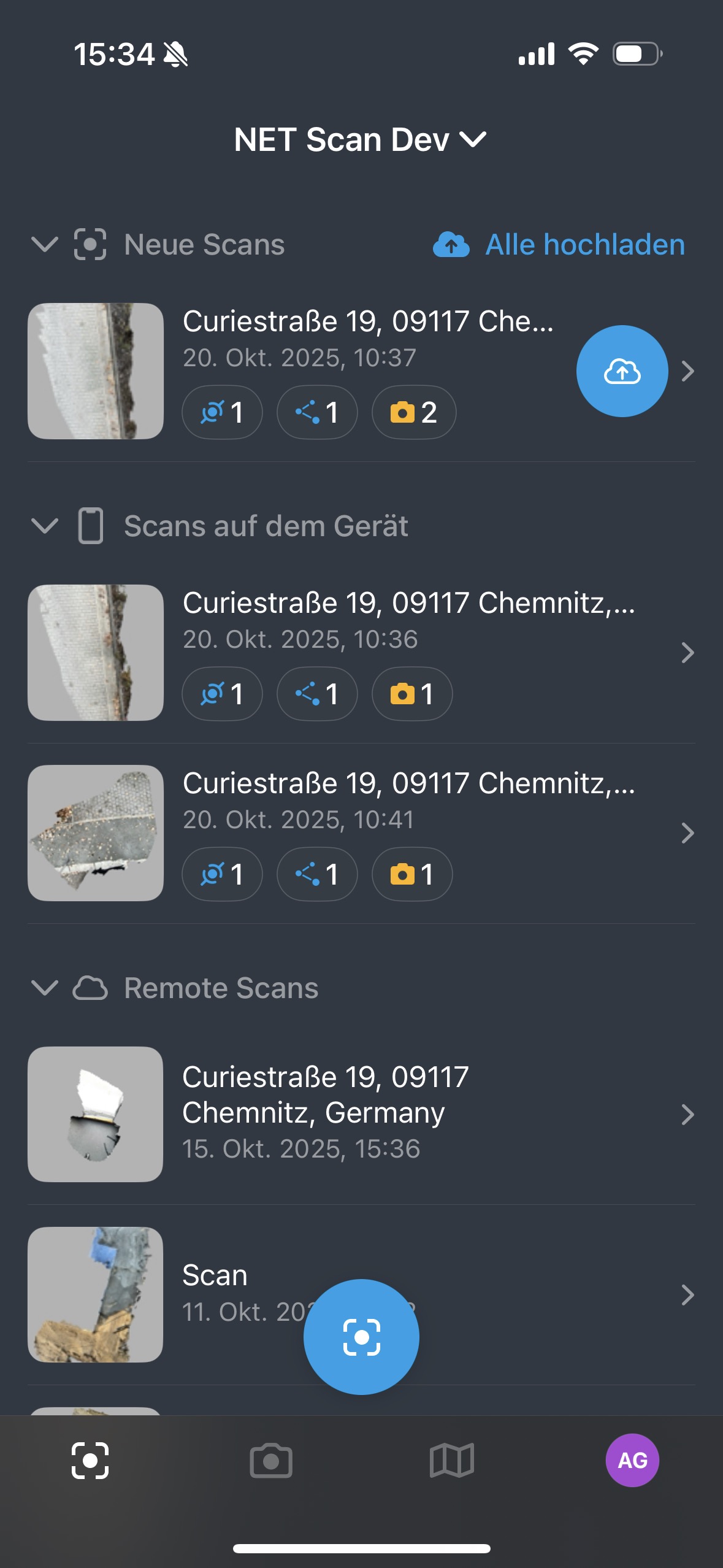 Neue Scans können per blauem Scan-Button ausgehend vom Hauptbildschirm von der Listen gestartet werden.
