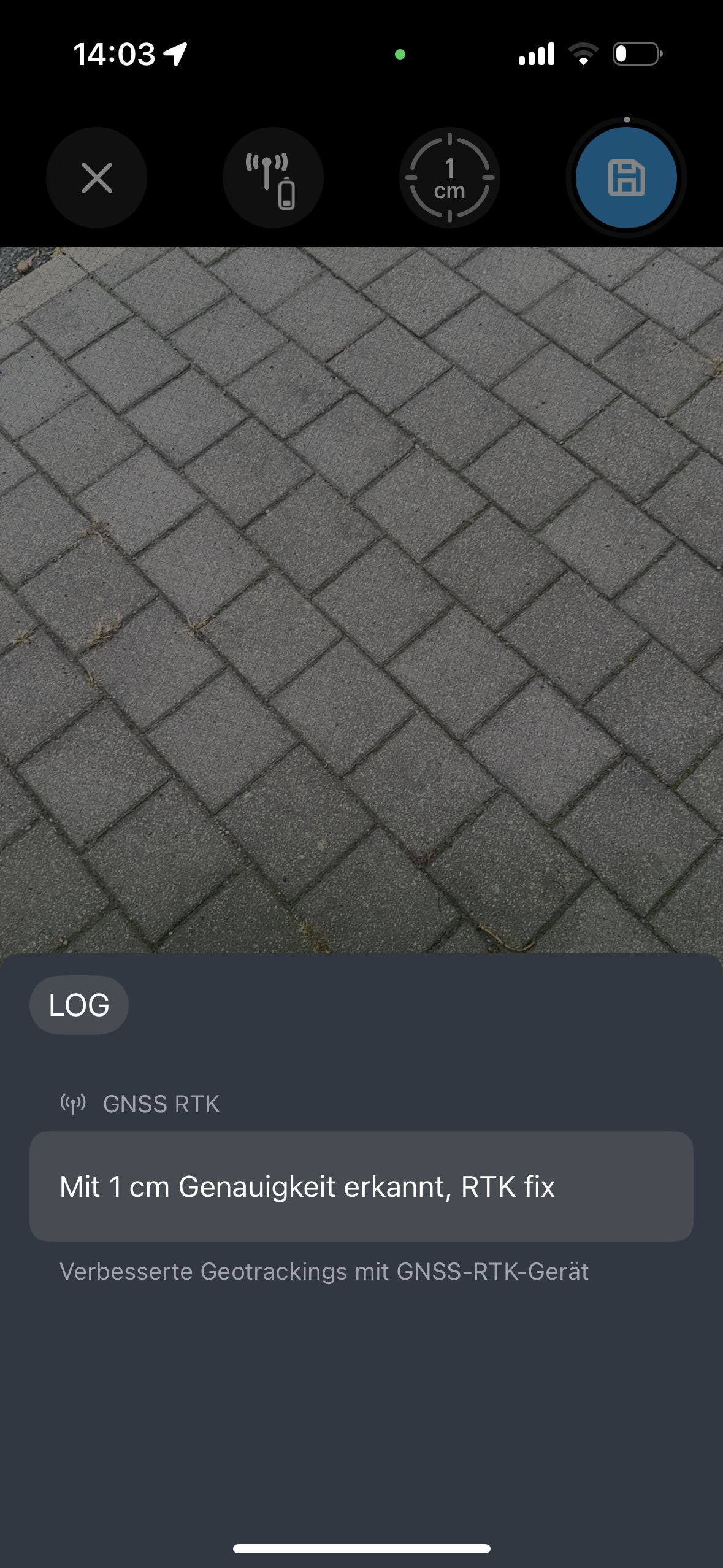 Nach erfolgreicher Verbindung mit dem GNSS-Receiver, sollte ein Scan erst durchgeführt werden, wenn die Genauigkeit mindestens unter 1,5 cm liegt und ein RTK Fix vorliegt, wodurch sich das Genauigkeits-Symbol grün färbt. Alternativ kann nach einer Wartezeit von 90 Sekunden auch mit schlechterer Positionsgenauigkeit ein Scan gestartet werden. Dies ist auch der Fall, wenn kein externer GNSS-Receiver verbunden wurde. Dann wird die ungenaue Positionierung im Scan von der App angemerkt und auch für später in der Detailansicht vermerkt. Damit ist das Scannen zu jederzeit ermöglicht.