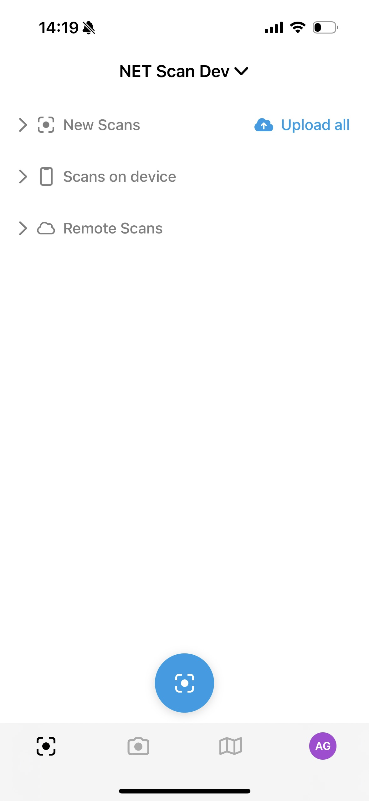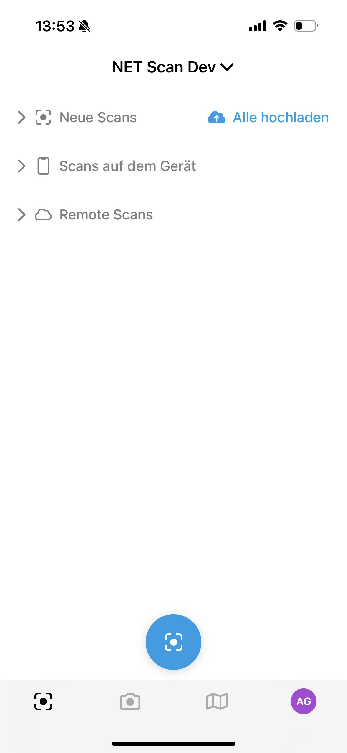 Die Scan-Liste ist in drei Kategorien unterteilt: Neue Scans, Scans auf dem Gerät und Remote Scans. Neue Scans umfassen alle Scans, die zwar gespeichert, aber noch nicht hochgeladen wurden. Scans auf dem Gerät sind lokal gespeichert und verfügbar. Remote Scans sind bereits in die NET Cloud hochgeladen, befinden sich jedoch nicht auf dem Gerät.