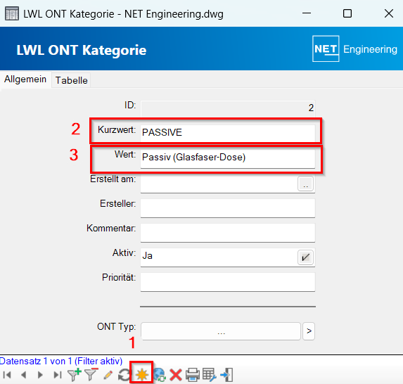 | 3 | ONT-Kategorie | Der ONT-Typ kann weiter kategorisiert werden. Die Werte dazu werden in der Tabelle "ONT-Kategorie" geführt. |