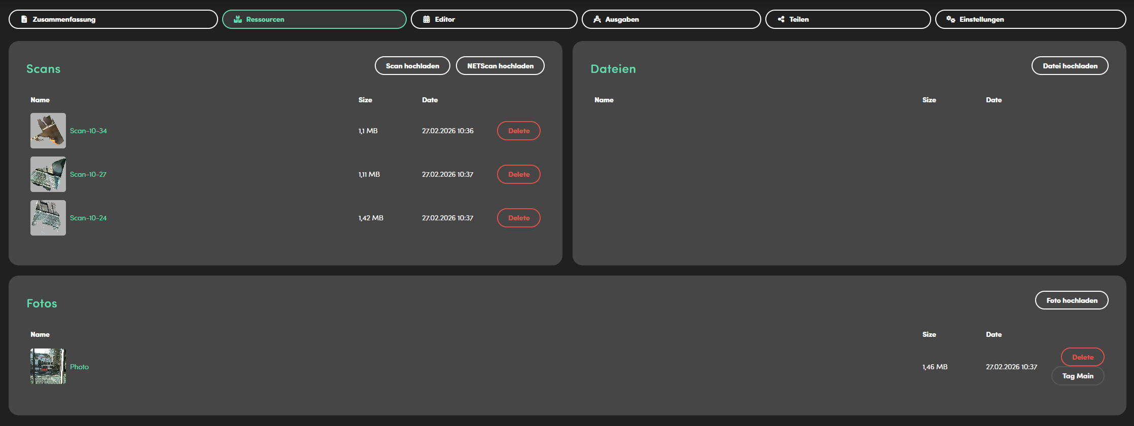 Am oberen Rand befinden sich die Auftragsbereiche. Mit jeweils einem Klick auf den Namen kann zwischen den Reitern gewechselt werden. Unter Ressourcen sind die hochgeladenen Scans, Fotos und Dokumente zu finden. Im Editor können die aufgenommenen Scans nachbearbeitet werden. Näheres dazu unter: Editor. Die Ergebnisse (Outputs) geben einen Überblick über den Auftrag: Hier sind die Fotos mit den überlagernden 3D-Objekten einsehbar sowie wichtige Anmerkungen und eine Liste an benötigten Materialien. Im Genehmigung (Share) Bereich kann der Auftrag zur Genehmigung verschickt werden. In den Einstellungen (Settings) kann der Auftrag gelöscht werden.