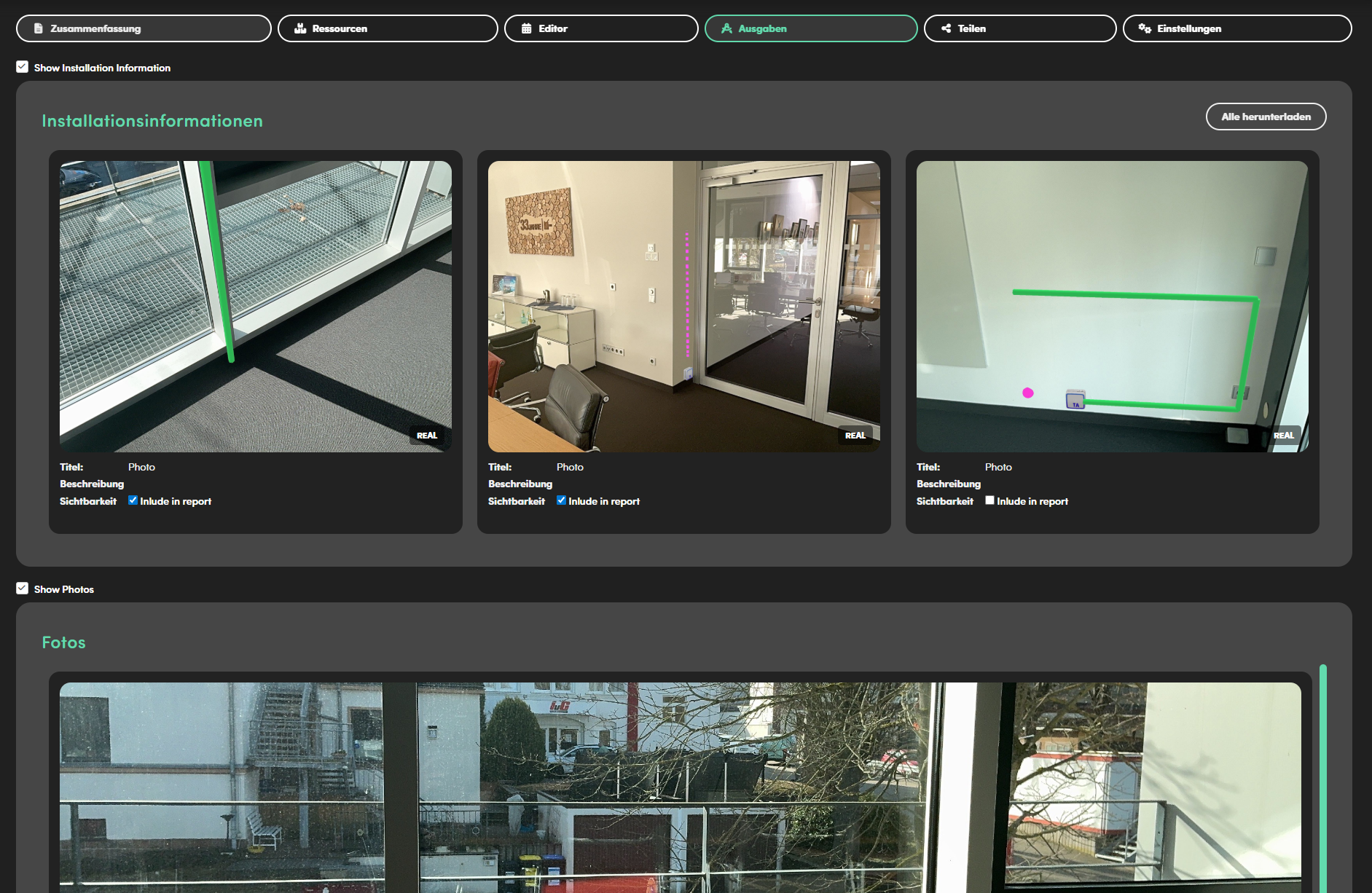 Die Installationsinformationen enthalten alle Bilder, die während eines Scans aufgenommen wurden, mit den dazugehörigen eingezeichneten Elementen. Unter jedem Foto steht sein Titel, seine Beschreibung und eine Checkbox, um die Sichtbarkeit im Report einzustellen. Je nach Einstellung, wird das Foto angezeigt oder ausgeblendet. Mit gedrückter linker Maustaste lassen sich Fotos in ihrer Position verschieben.