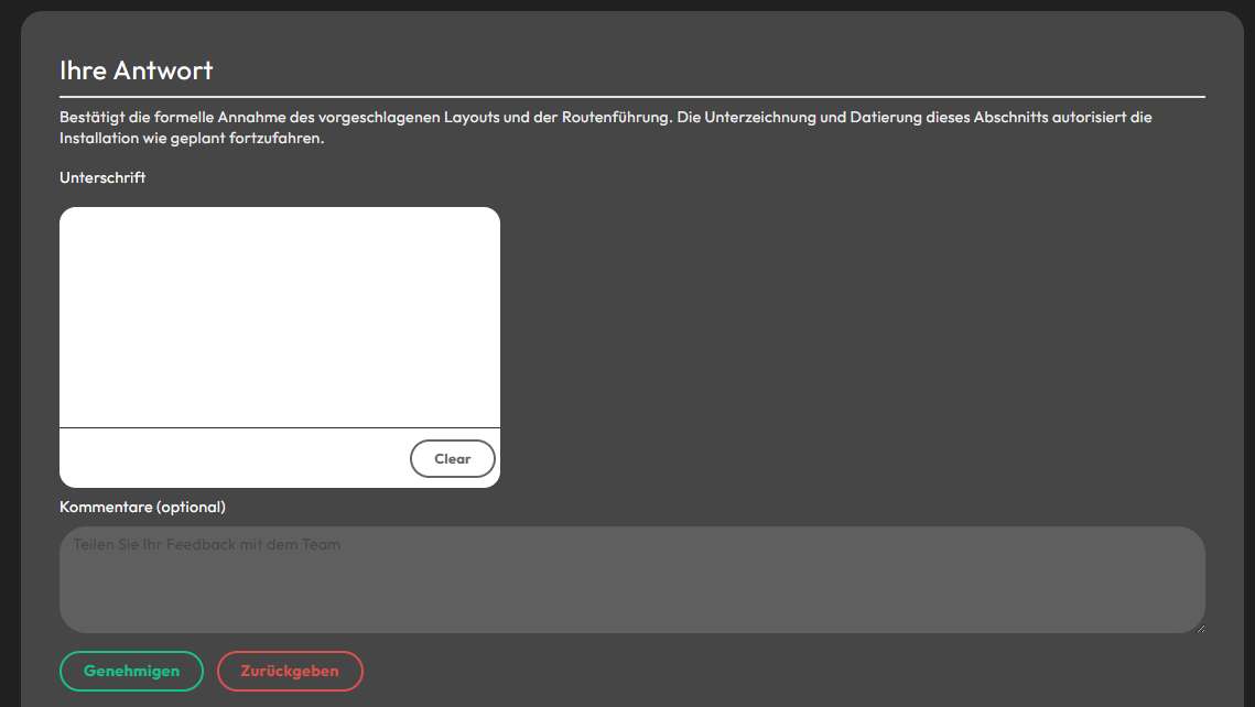 Der Report endet mit der Möglichkeit eine Unterschrift zu setzen und den Plan zu genehmigen oder zur Überarbeitung zurückzugeben. Zusätzlich kann ein Kommentar angefügt werden, um Feedback zu geben.