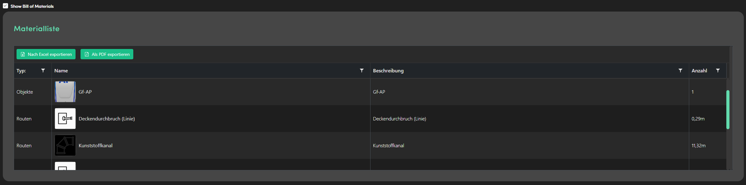 Der letzte Abschnitt "Materialliste" zeigt die im 3D-Scan platzierten Objekte in Form einer Tabelle an. Alle Objekte haben einen Typ, einen Namen und eine Beschreibung. Weiterhin wird die Anzahl der 3D- und Punktobjekte sowie die Gesamtlänge der Linienobjekt angezeigt.