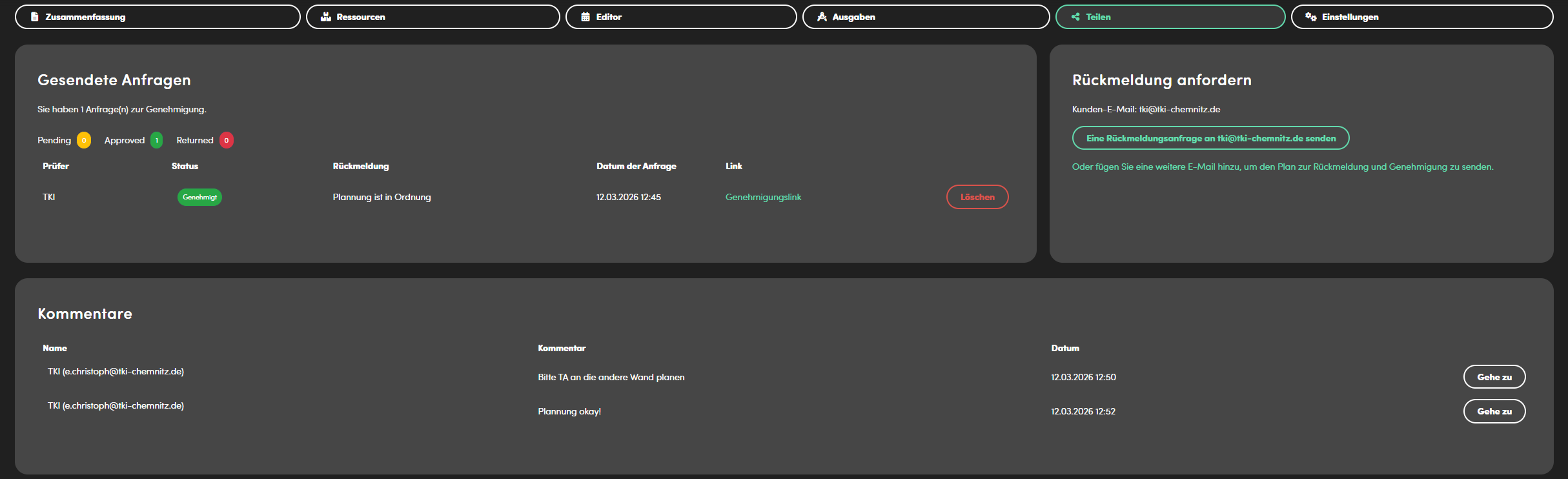 Der Report wird über den Genehmigung-Bereich erstellt und verschickt. Der Bereich ist in drei Teile geteilt. Oben links werden die verschickten Anfragen aufgeführt. Jede Anfrage enthält den Namen des Empfängers, den Status der Anfrage (auf Genehmigung warten, genehmigt, abgelehnt), das Sende-Datum und den Link zum Report. Verschickte Genehmigungen können aus dieser Liste über den Löschen-Button wieder entfernt werden.