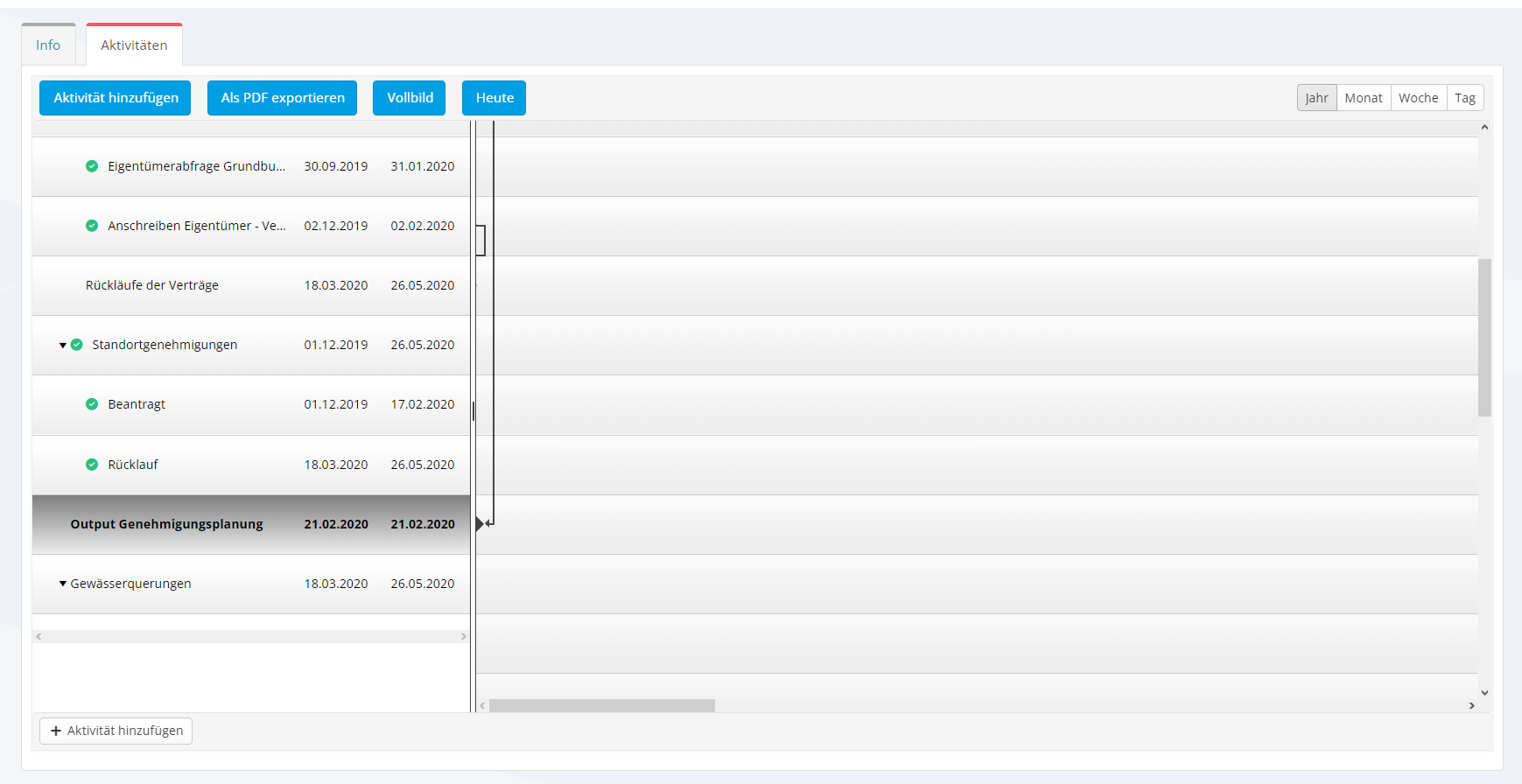 The central element of project management is the project plan. The activities to be planned for a project can be moved using drag and drop. It is also possible to add and remove new activities.
