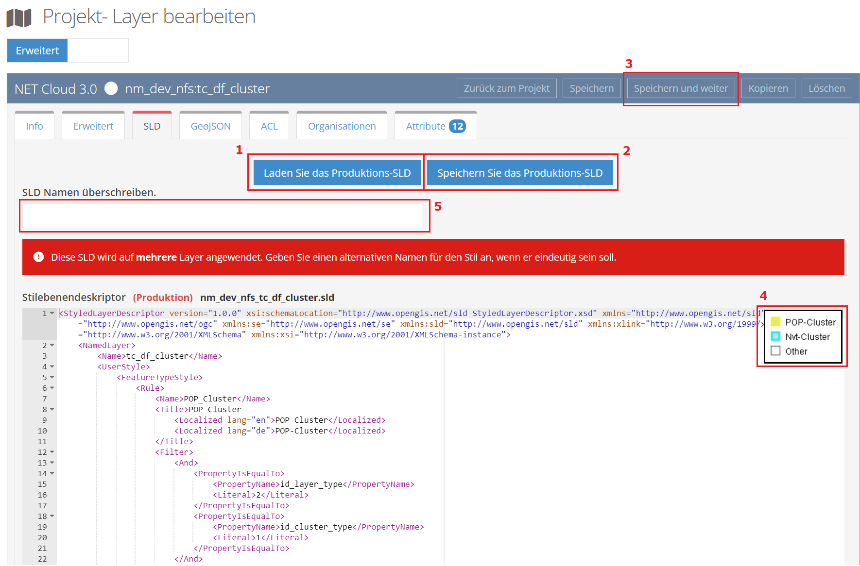 If the message “This SLD is applied to multiple layers” appears, the SLD with the name “nm_dev_nfs_tc_cluster.sld” in this example is also used in other projects. This means that if the style file is modified, the style will also change in other projects. The advantage is that a style only has to be defined once and can be reused.