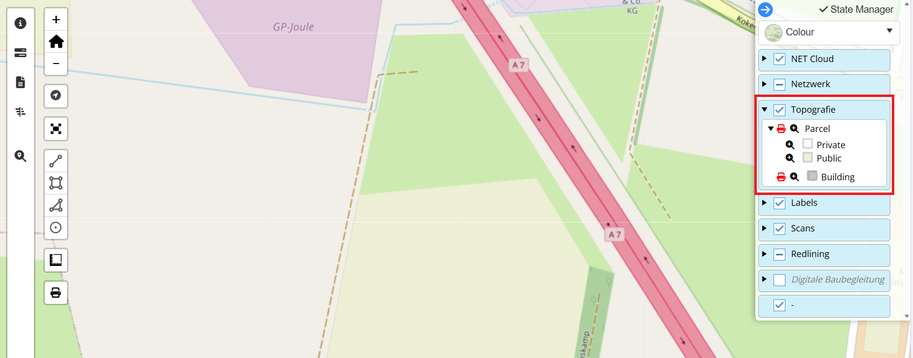 In the layer overview of the project, additional layers can be added to the NET Cloud project via the buttons “Search layer” or “Add layer”.