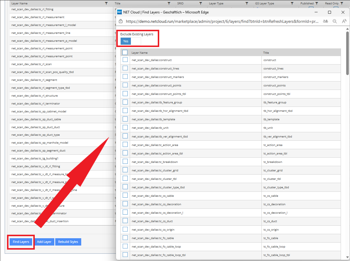 The layer to be added must be published in the GeoServer. Using “Search layer”, you receive an overview of all available layers of the connected GeoServer. The overview can be restricted via the slider (1) to layers not yet added to NET Cloud. However, adding the same layer multiple times is possible.