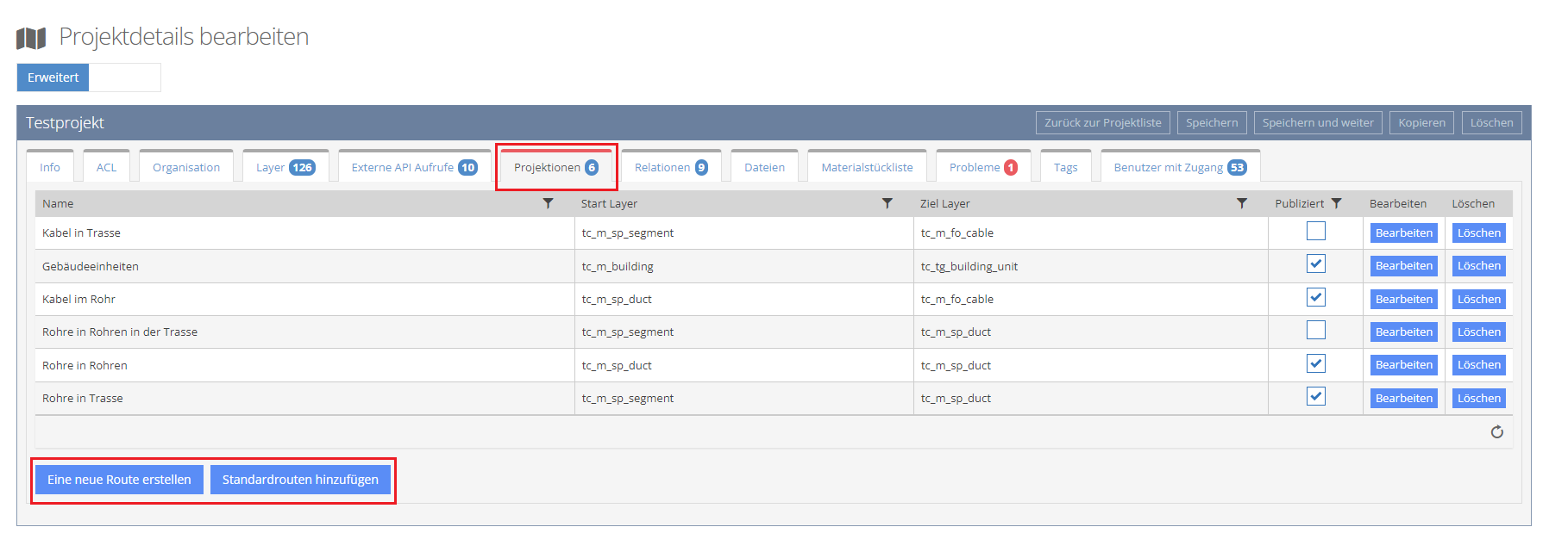 The projections can be accessed via the corresponding tab in the project settings. Creating a new route is possible via the button “Create a new route”. Using the button “Add standard routes”, the predefined routes