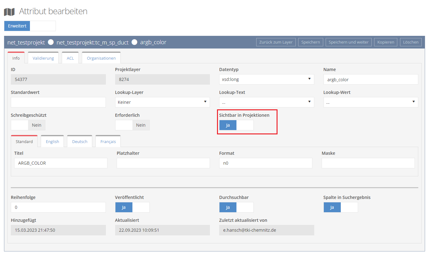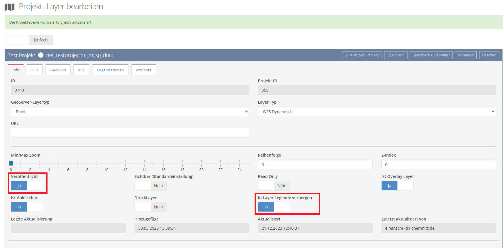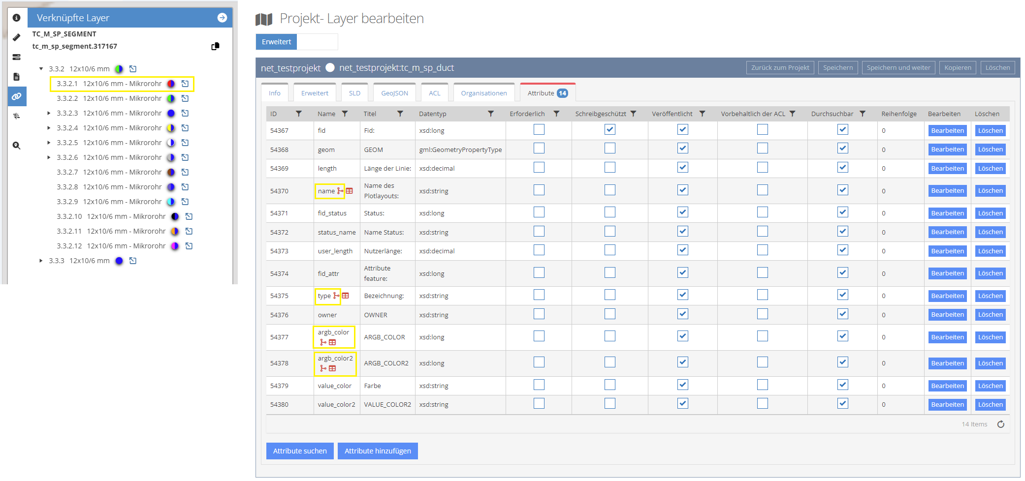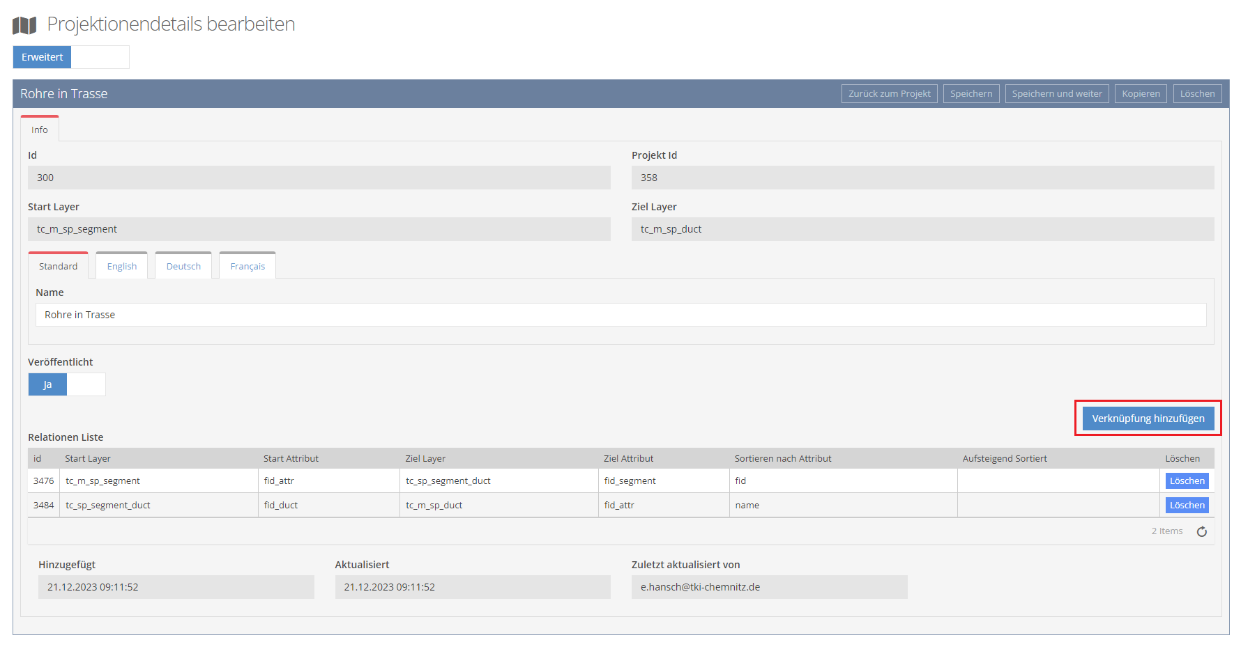 A projection consists of a start layer – in this example the trench tc_m_sp_segment – and a target layer – the ducts tc_m_sp_duct. Each projection requires a name. The name can vary depending on the language. The “Published” slider controls whether the projection is available to the user.