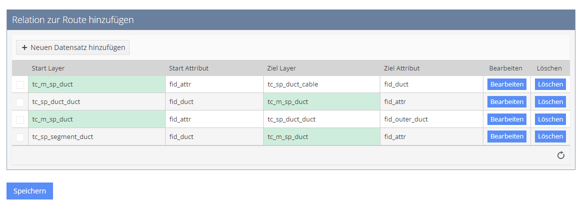 The last target layer from the list of relations is highlighted in color in the new window. New relations can be defined via “Add new record”. Existing relations can also be edited. Caution is advised here, as changes apply to the entire project.