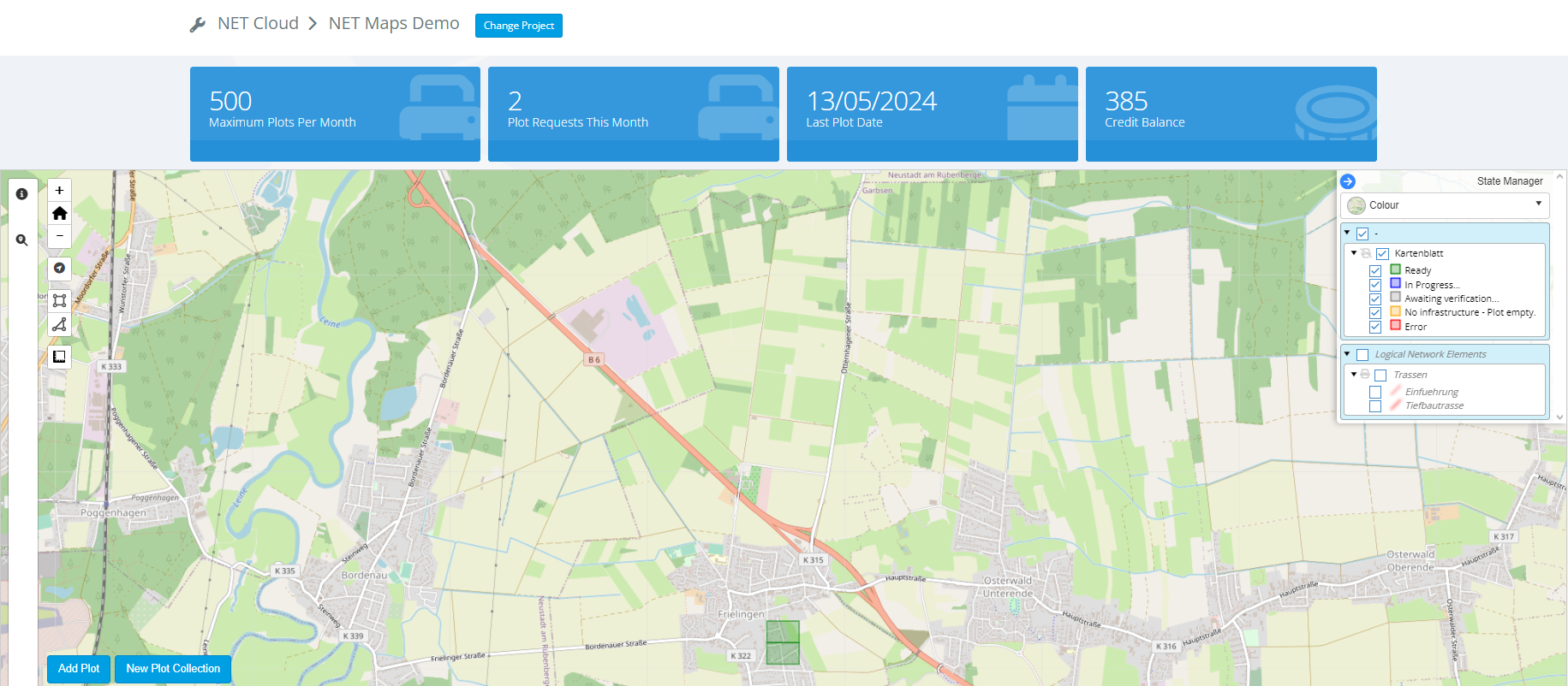 NET Maps projects open up a whole new dimension of using NET Cloud for users. In NET Maps, users can explore specific areas within their project through so-called map queries. This feature allows for the customization of colors, lines, and symbols, enabling users to tailor the display to their personal preferences.