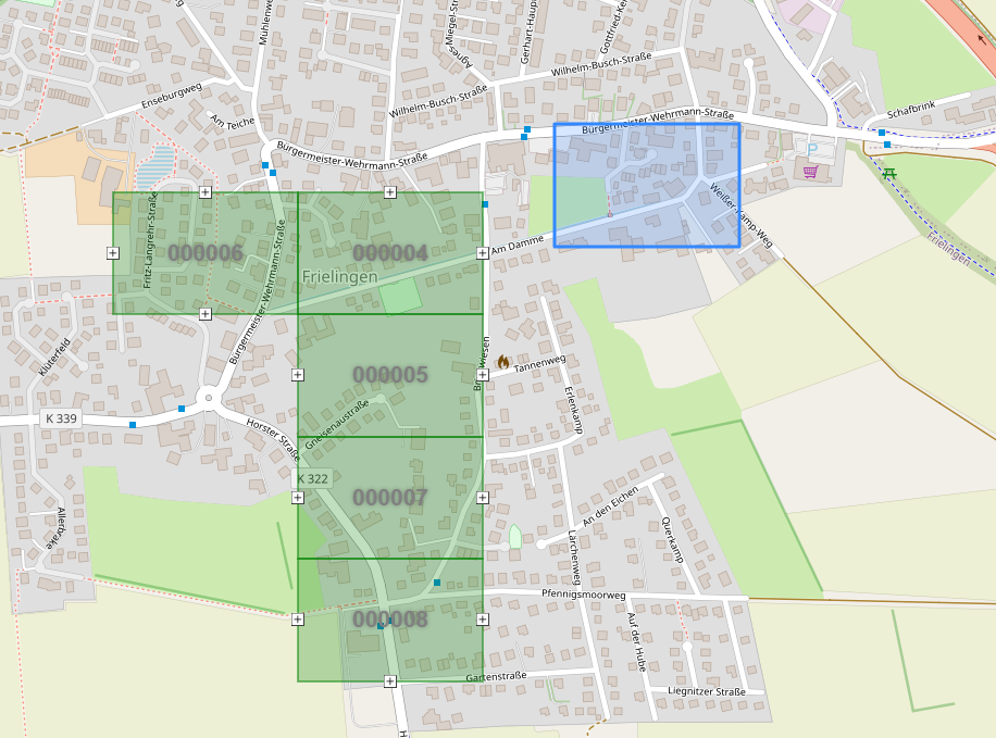 It is now possible to select the desired area that should be displayed on the map sheet on the map. The user can do this by freely marking an area on the map using the blue rectangle or by clicking on one of the plus symbols at the edge of an already existing map sheet. In this way, a new map sheet is added at that location.