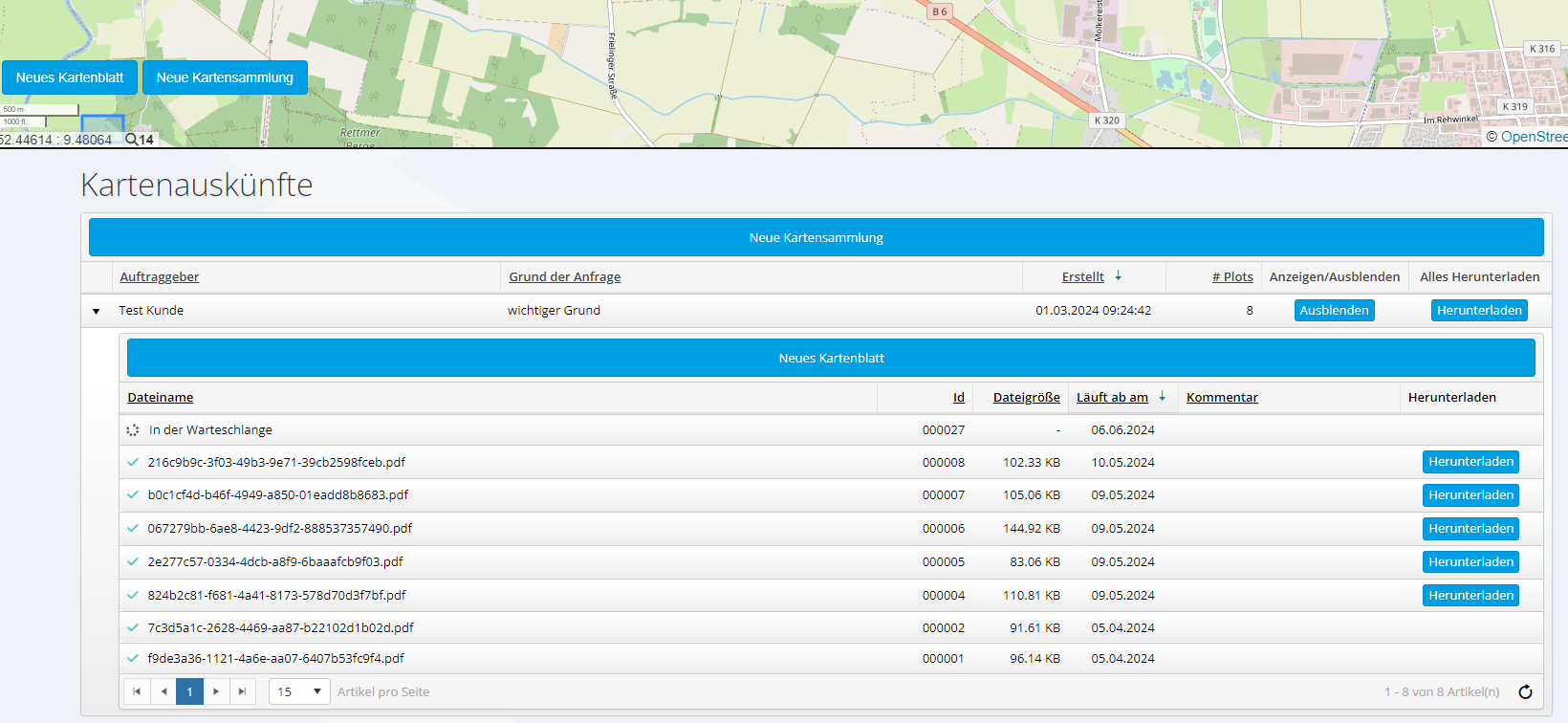 After the user has created a map collection and map sheets, they can find them in the overview below the map. The new map sheets are created here and assigned to the corresponding map collection. In the overview, the user also has the option to download the completed map sheets with a single click.
