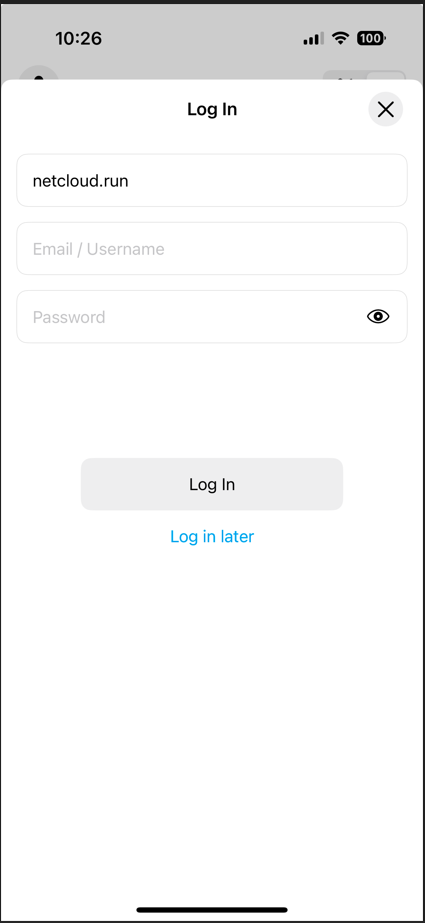 To log in, you need to enter the instance, email address, and password. The process is completed by clicking "Log In", or can be canceled by selecting "Log In Later".