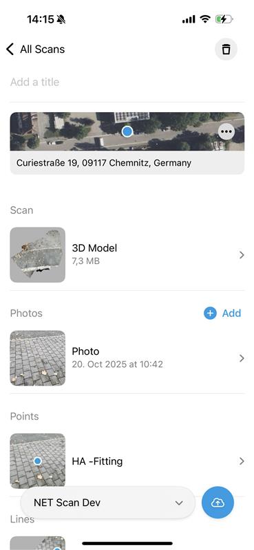 Each scan entry displays a thumbnail of the scan, the title—ideally based on the location—, the date and time of the scan, and indicators showing whether points, lines, and photos were added. A scan can be tapped to open the detailed view.