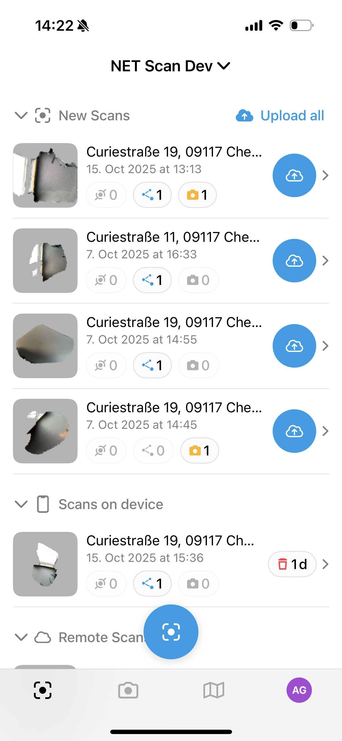 The scan list is divided into three categories: New Scans, Scans on Device, and Remote Scans. New Scans include all scans that have been saved but not yet uploaded. Scans on Device are stored locally and available on the iPhone. Remote Scans have already been uploaded to the NET Cloud but are no longer stored on the device.