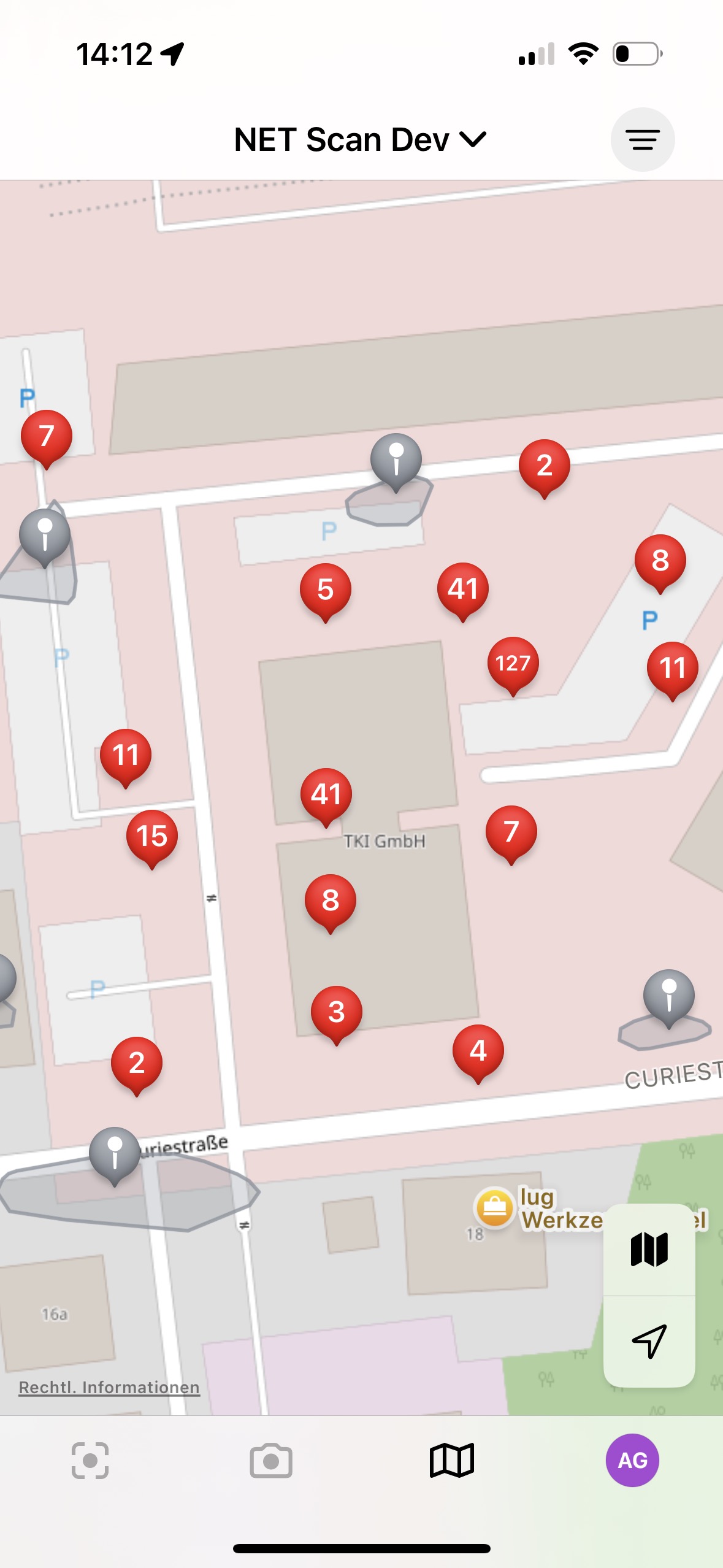 Switching to the map view changes the overview to a map-based layout. Navigation follows familiar map controls: the map can be moved with one finger and zoomed with two fingers. Scans are displayed on the map as clusters. To view scan details, tap on the corresponding scan or cluster. The list view then slides up from the bottom of the screen, allowing you to select the correct scan.