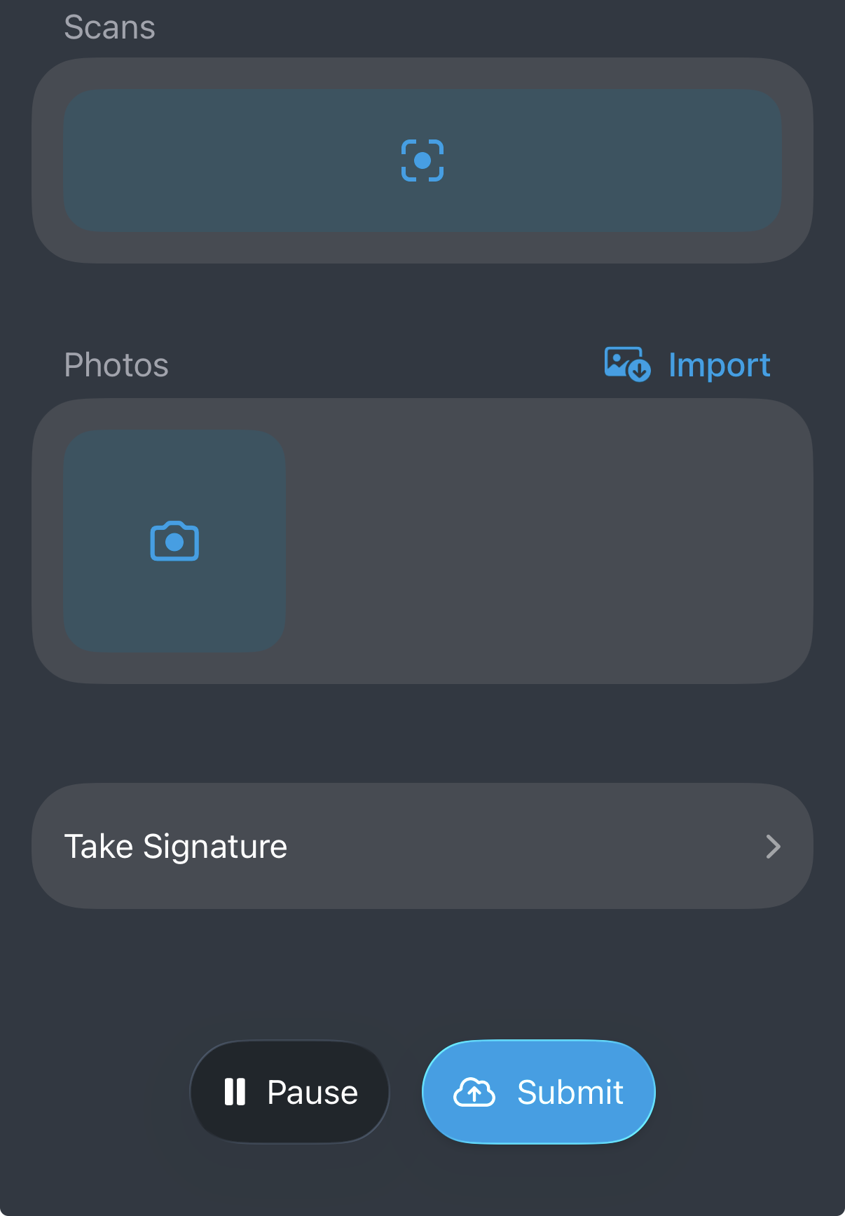 Tapping Submit uploads the job’s photos and scans and changes the status to Review. In this status, photos and scans can no longer be created, but input fields remain editable.