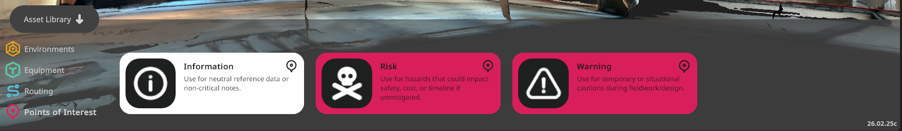 In the Points of Interest (POIs) section, three different note types are available: Information, Risk, and Warning. In addition to a thumbnail, the name and a description are displayed.