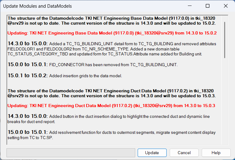If the modules and the data structure of the project are not up to date, the following message appears: