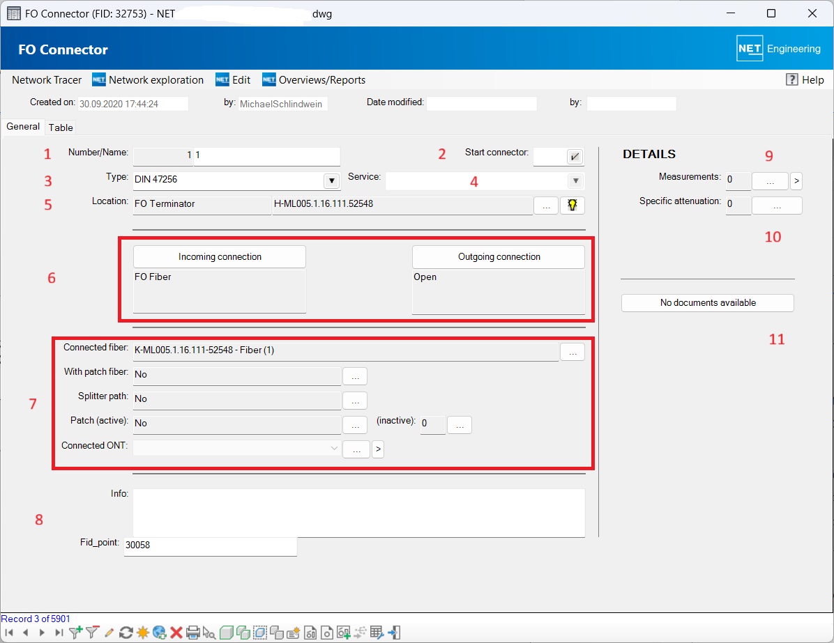 | Details | If measurements have been stored for the connector, the corresponding number is displayed. Clicking on the If a specific attenuation has been specified for the connector, the number of corresponding records is displayed and the form can be opened. (10) |
