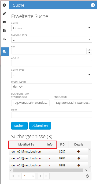 If the checkbox is enabled in the attribute settings, the information is included as a column in the search results, e.g. “Modified By”, “Info”, “FID”. If no attribute is defined as a column, “FID” is added as a column by default. |