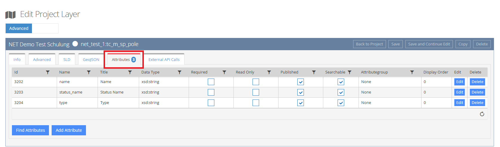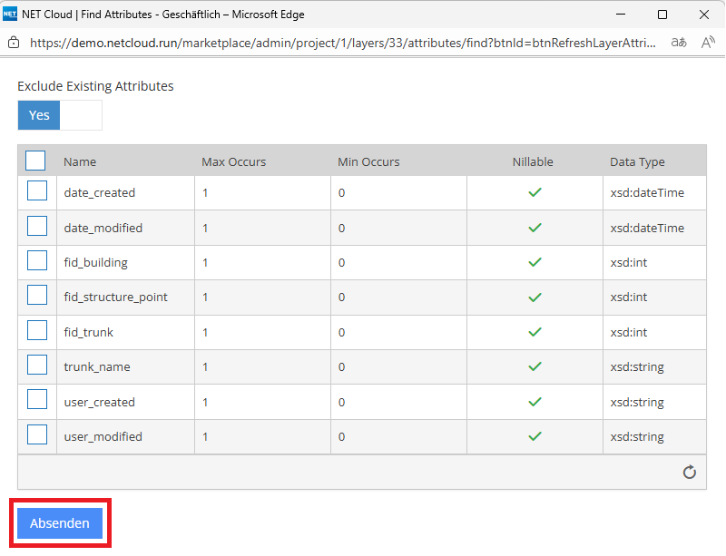 Specific attributes are defined for each layer in a project. These can be loaded from the GeoServer into NET Cloud and used in the map view. Which attributes are actually available in NET Cloud can be viewed and adjusted under the “Attributes” tab on the “Edit project layer” page.