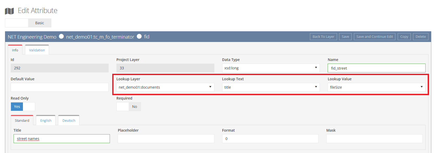 Sobald dies geschehen ist und in dem Layer "tc_tg_street" die Attribute name und "fid" publiziert sind, können diese als "Lookup-Wert" und dem anzuzeigenden Wert "Lookup-Text" eingefügt werden.