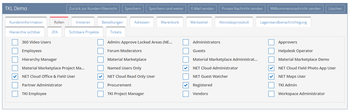 The detail view of a user/customer contains, in addition to “Customer information” and “Roles”, a large number of further tabs with detailed information on various topics related to the user.