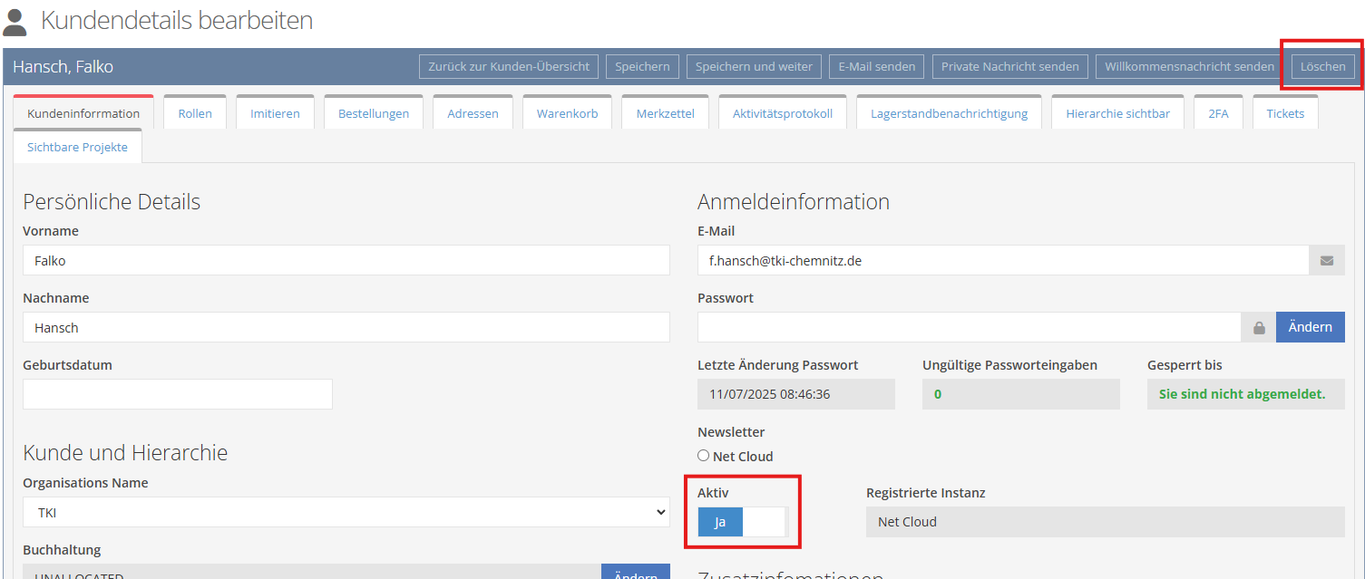 However, we strongly recommend not deleting users from the system. Instead, it is more advisable to deactivate users, as restoring deleted users is only possible with considerable effort.